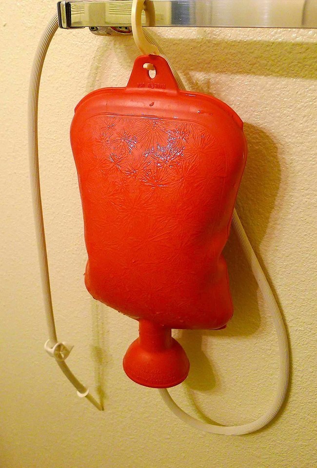 Image yourself getting undressed in your bedroom before your nightly bath.  You walk into the bathroom only with a towel around yourself and you see this filled red bag hanging from the window sill.