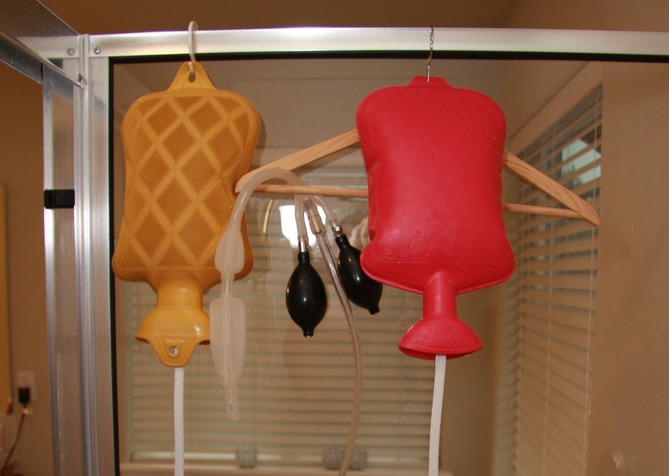 Of course you plead but to no avail. Soon you’re be on your elbows and knees with your butt up in the air while mom inserts the nozzle up your butt and opens the clasp.  Poor boy!